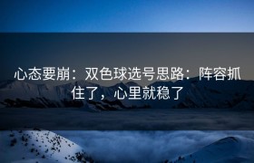 心态要崩:双色球选号思路:阵容抓住了,心里就稳了 当面对双色球这类具有强随机性的游戏时,很多人第一时...